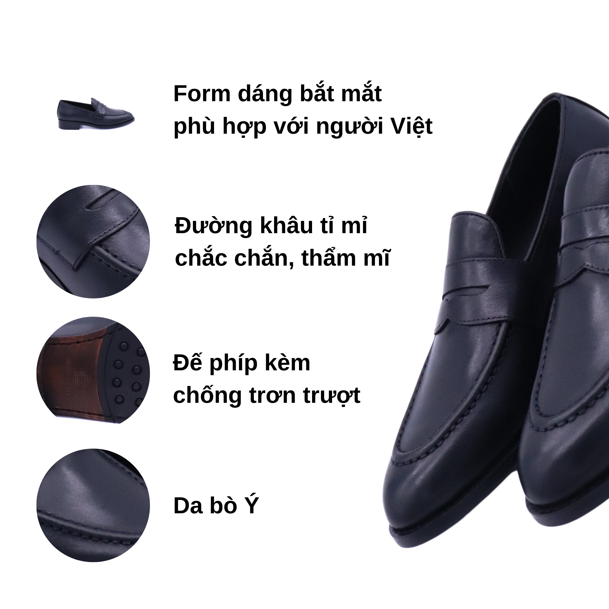 Giày loafer Bill’s Corner – BBL2412121 được sản xuất từ 100% da thật nhập khẩu, đế phíp chống trơn trượt, thiết kế theo phom dáng người Việt ôm chân giúp bạn tự tin khi cất bước. BBL2412121 đều phù hợp với nơi công sở hay dùng để đi chơi. Năng động, tự tin trên từng bước chân.